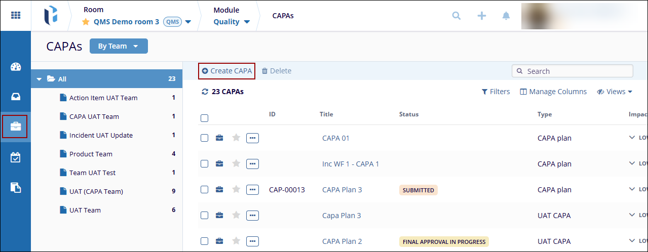 - Within the ‘Quality’ module, click on the CAPAs modal from the left-hand navigation pane.
