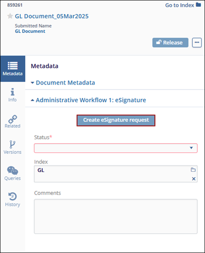Once the Pending documents are claimed, an eSignature request can be created and the document can be sent to the appropriate users. Once the document is successfully claimed, it can be located in the eSignature Requests folder.