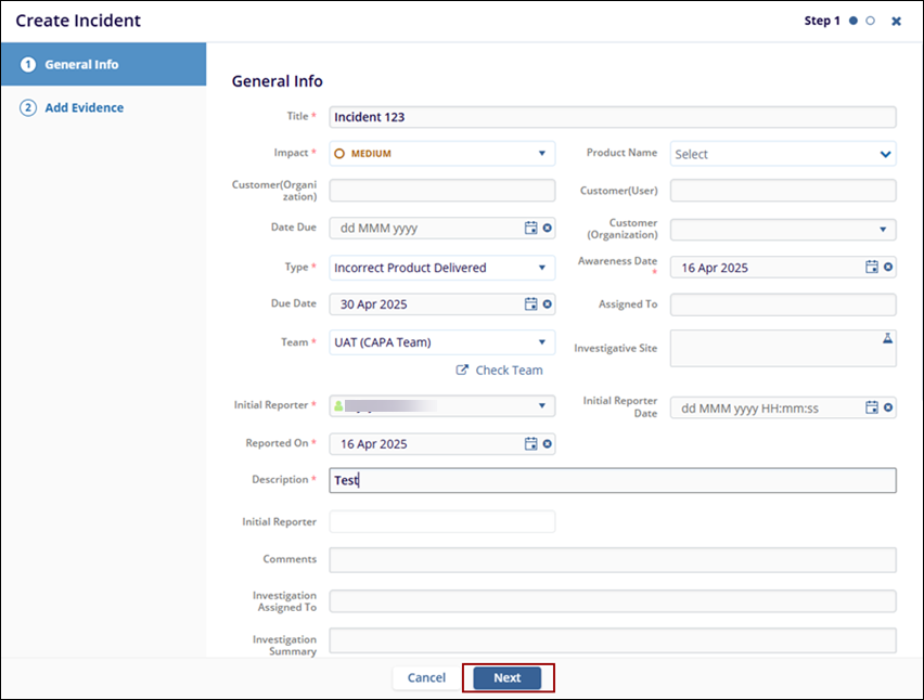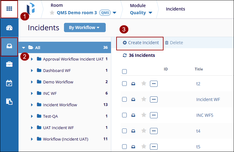 This section explains how to create an Incident in the Quality Module. To create an Incident, the ‘Create Incident’ Action should be added to the user in the User Management Module.
