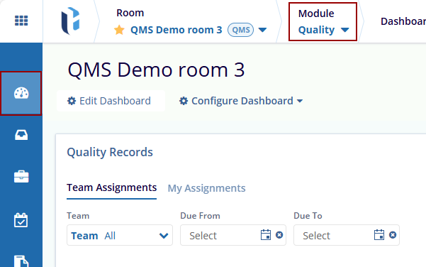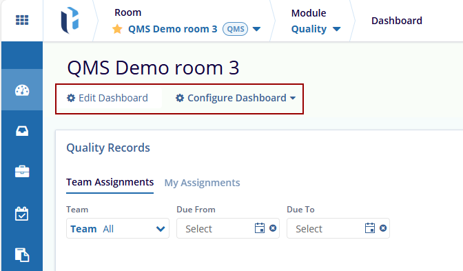 Quality Dashboards displaying records assigned to them or their teams through the My Assignments and Team Assignments Dashlets. Users can interact with these records using filters, charts, and grid views.