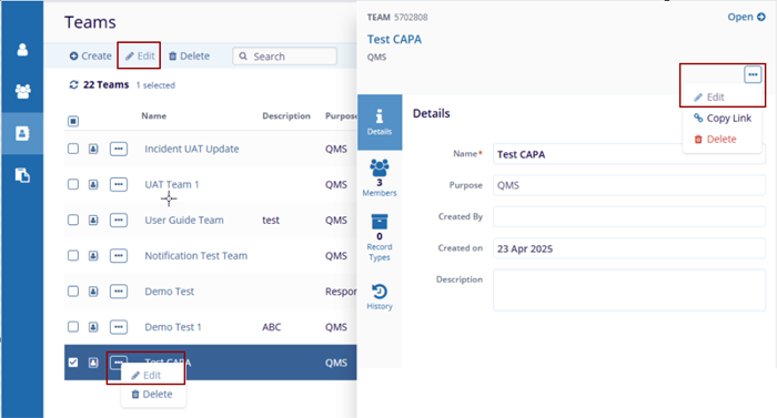 Note: The user can access the Edit option either through the three-dot menu next to the created Team in the grid or from the three-dot menu in the metadata panel.