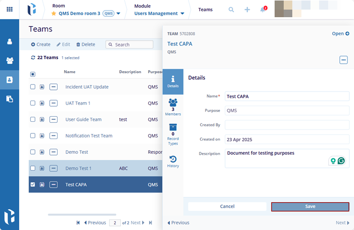 - Make some changes in the Teams and click the Save button in the metadata panel