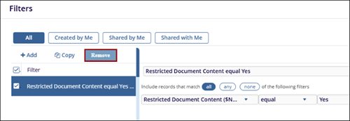 Users can view the filters that are created, shared by and shared with them by clicking the required tabs in the Filters window.