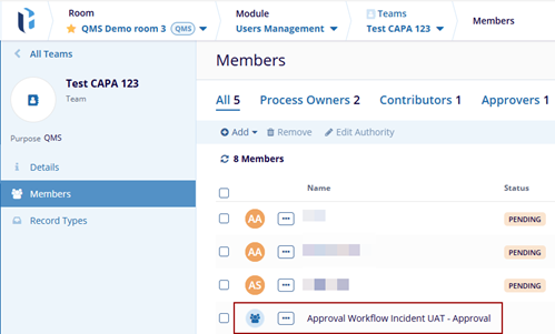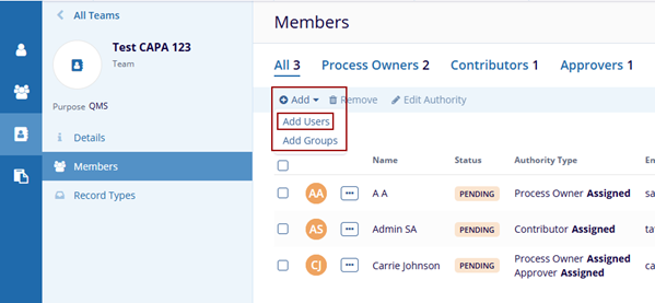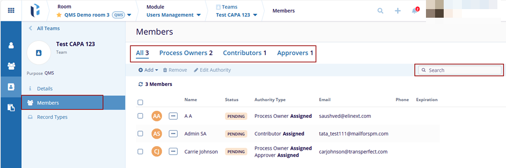 The Members page displays a list of users linked to the team, along with options to Add, Remove, or Edit their authority roles. It also includes tabs showing the count of users in each team and provides a Search function for easy user lookup.