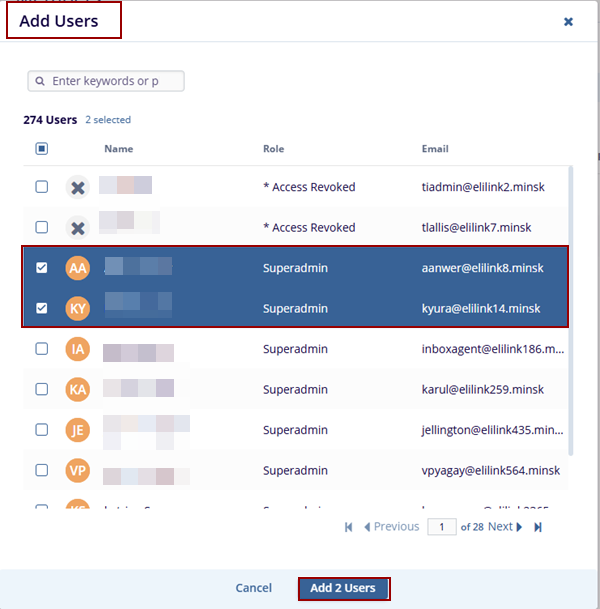 - Click the Add Users option, and the Add Users pop-up window is displayed with the list of users.