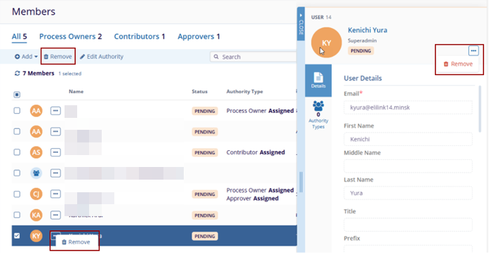 Select the checkboxes next to the Users/Groups that need to be removed from the Members page grid view.