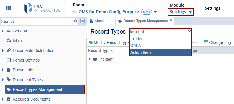category, i.e., Incident, CAPA, or Action Item, from the dropdown.