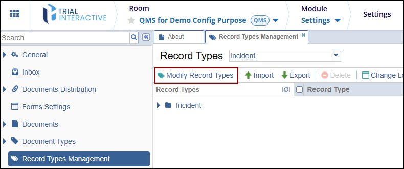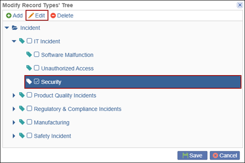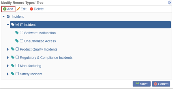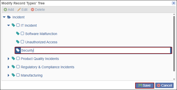 - To delete a record type, select the record and click on the ‘Delete’ button on the ‘Modify Record Types’ tree window.