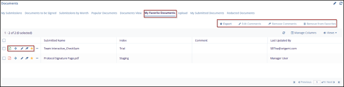 - Review the list of documents marked as favorites from the document index, displayed with their details (e.g., Submitted Name, Index, Last Updated By).