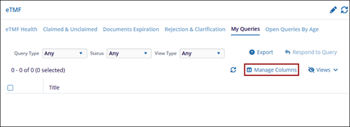 - In the eTMF dashlet, and select the My Queries tab.