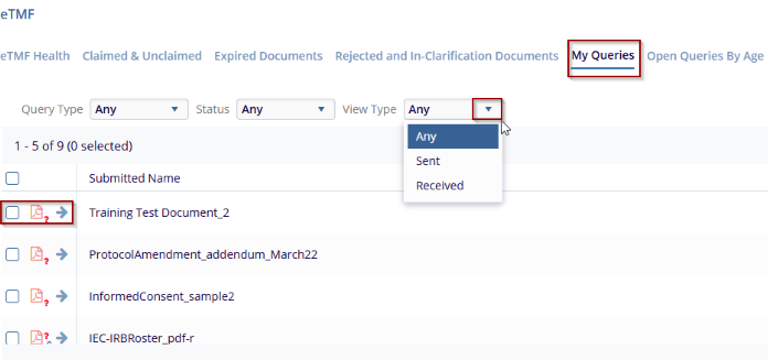 My Queries in the eTMF allows the users to view and manage queries related to the documents they are working on. Queries could be either sent (by the user to someone else) or received (from others to the user). This helps to track the status of queries and allows the user to take actions such as responding to or exporting query details.