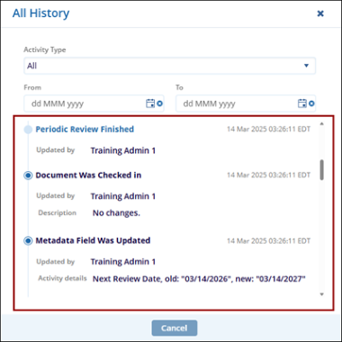 - On the All History tab, view all the periodic review actions.