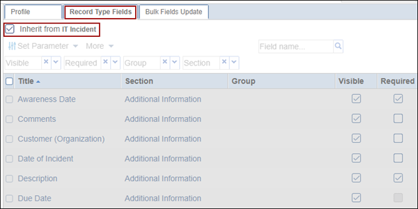 - Click on the ‘Record Type Fields’ tab and uncheck