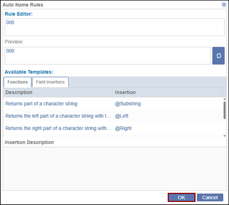- On the Auto Name Rules window, add the necessary details in Rule Editor and select the required options from the Functions and Field Insertions from the Available Templates section.
