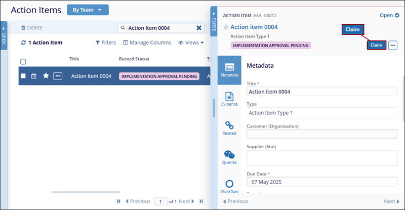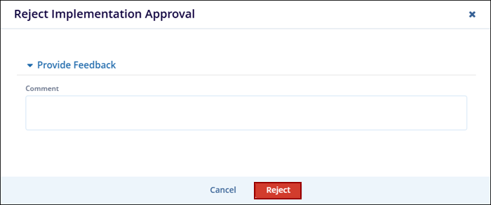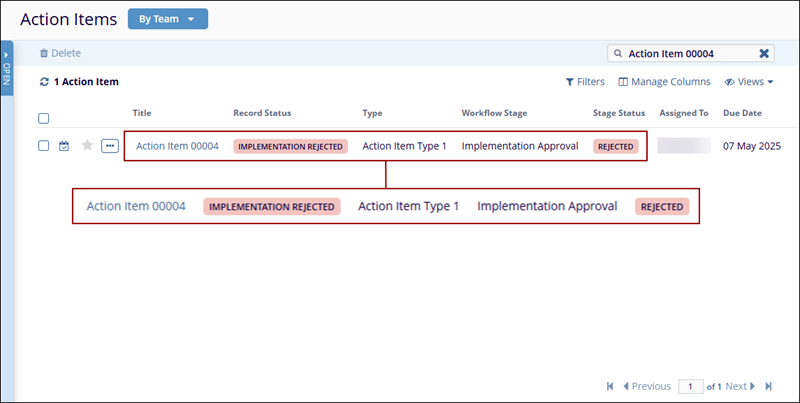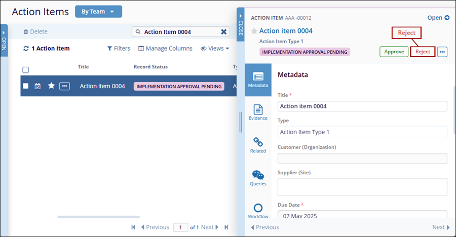 Authorities within the workflow stages can reject an Action Item record based on the stage-specific configuration. Rejections typically occur during the Approval stage by the designated Approver. When an Action Item is rejected, it is sent back to the previous stage. For instance, if a record is rejected at the Implementation Approval stage, it will return to the Implementation stage.