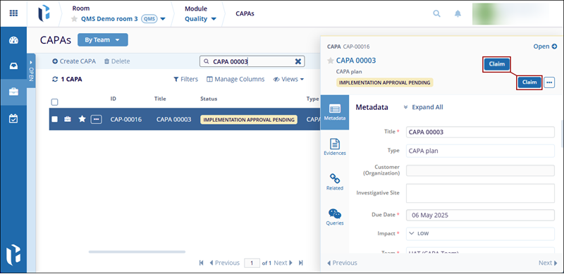 - Create a CAPA record as an originator user and send it to the first stage of the approval workflow by following the steps detailed in the Create CAPA section.
