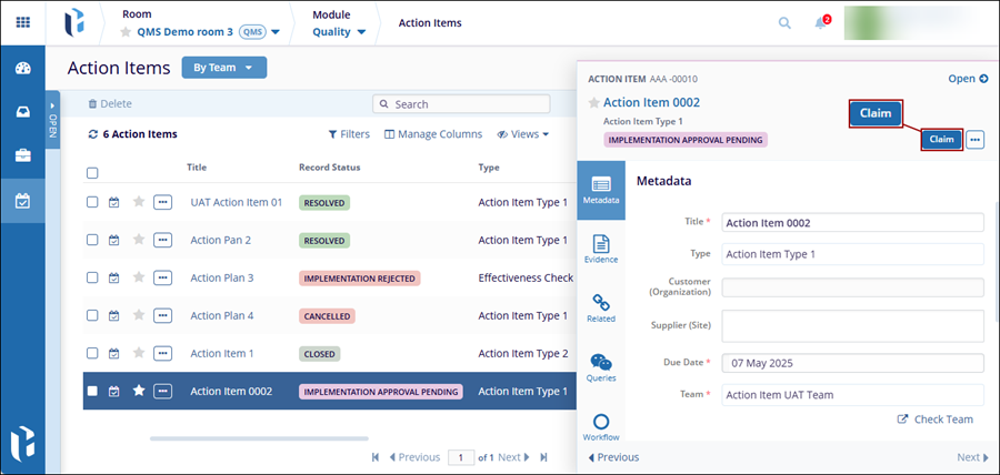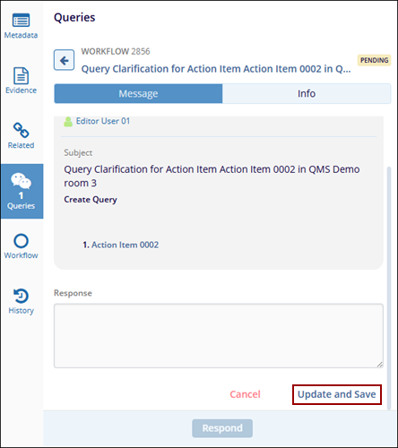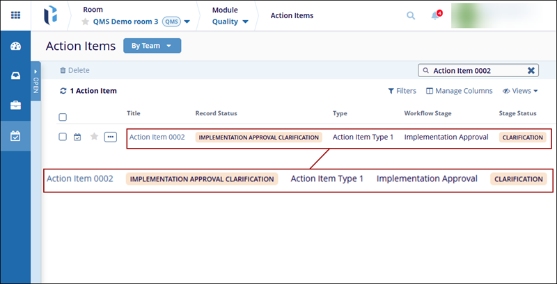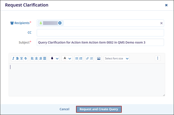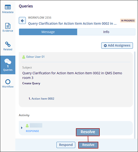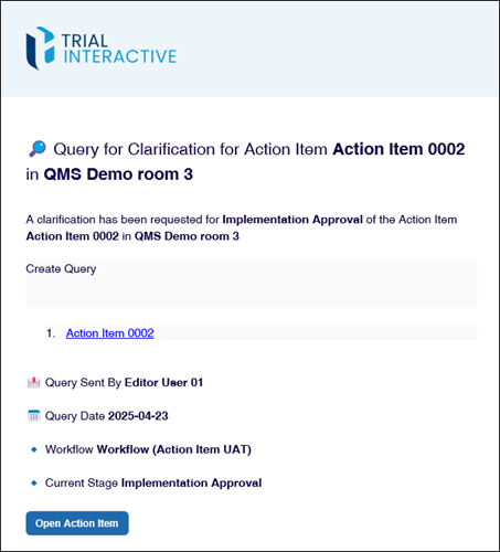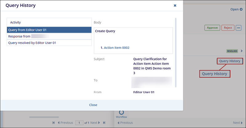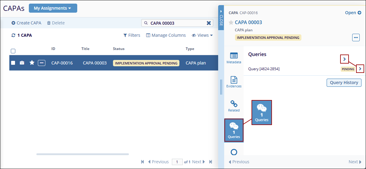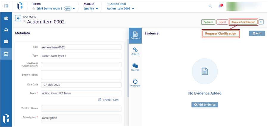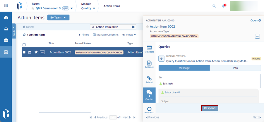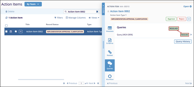 When an Action Item progresses through the workflow stages, the assigned authorities at each stage can request clarification or create a query for the CAPA record, based on the workflow stage configuration.