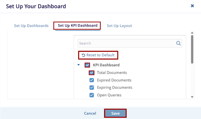 The Set Up KPI Dashboard allows users to configure key performance indicator (KPI) metrics on the user’s dashboard. The selected dashlets are displayed on the top right corner of the screen.