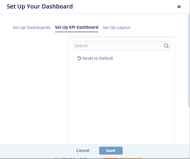 The Set Up KPI Dashboard allows users to configure key performance indicator (KPI) metrics on the user’s dashboard. The selected dashlets are displayed on the top right corner of the screen.