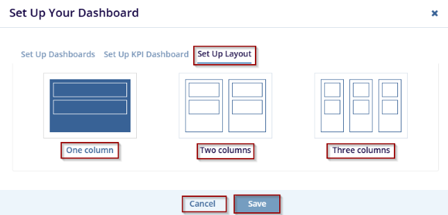 The Set-Up Layout allows users to customize the visual structure of the dashboard by choosing a column-based layout. This ensures that the dashboard is organized according to user preferences. The user has the option to select from – One, Two, or Three Columns.