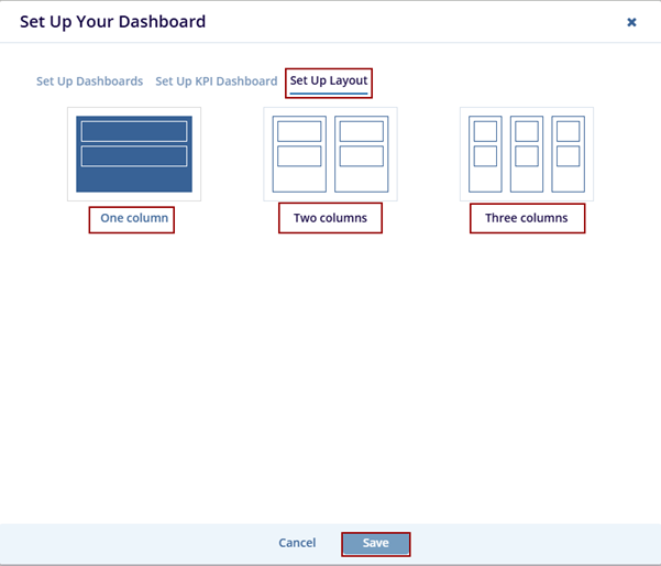 The Set-Up Layout allows users to customize the visual structure of the dashboard by choosing a column-based layout. This ensures that the dashboard is organized according to user preferences. The user has the option to select from one, two, or three Columns.