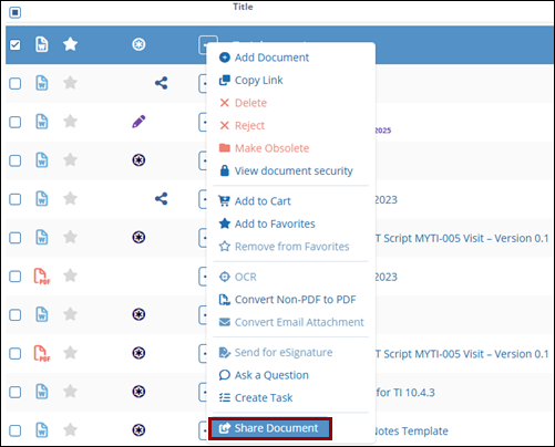 The Share Document option allows users to share a selected document with other users or stakeholders, enabling easy access and collaboration without downloading the file.