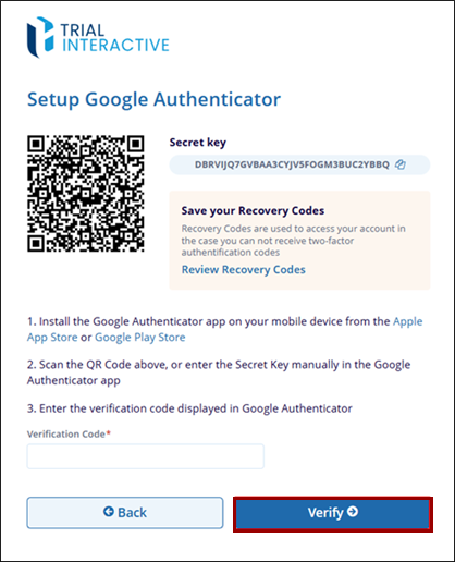 For Google Authenticator App, install the app from Google Play Store, or Apple Play Store. Scan the QA code on the Setup Google Authenticator page or enter the Secret Key in the Google Authenticator app. Enter the verification code displayed in Google Authenticator and click on the Verify button.