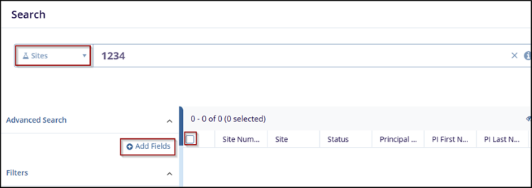 - If required, click the Add Fields button to include additional search parameters or filters (such as Site Number, Status, or Principal Investigator) to refine your search.