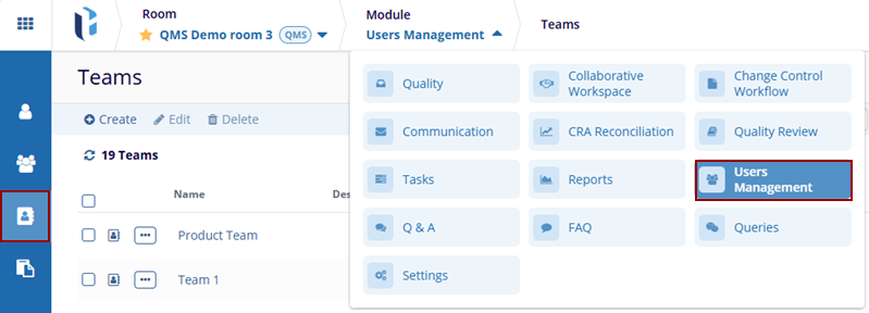 - Navigate to the Users Management module within the QMS room, or click the Module dropdown and select the Users Management module option.