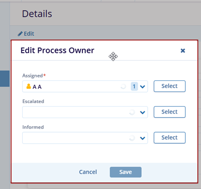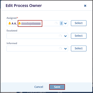 - The user navigates back to the Edit Process Owner pop-up window; hence the selected user is added in the Assigned field.