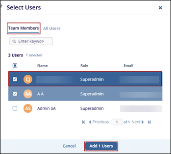 - The Select Users pop-up window displays two tabs: Team Members and All Users. By default, the Team Members tab is selected, showing a list of users associated with the team.