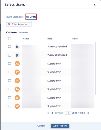 - On the ‘Select Users’ pop-up window the All-Users tab displays the list of all users from where the users can be added as per the requirement.