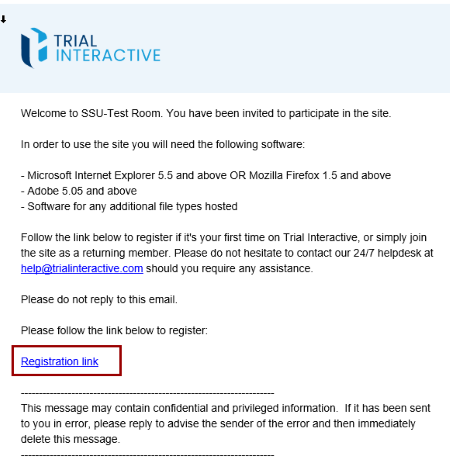 The Trial Interactive Room Administrator has sent invitations to users, and they will receive an email with a registration link.
