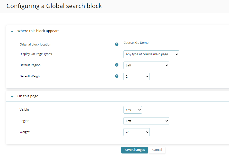 Note: Each block has different settings to configure. - On the search block settings page, configure the required settings and click on the