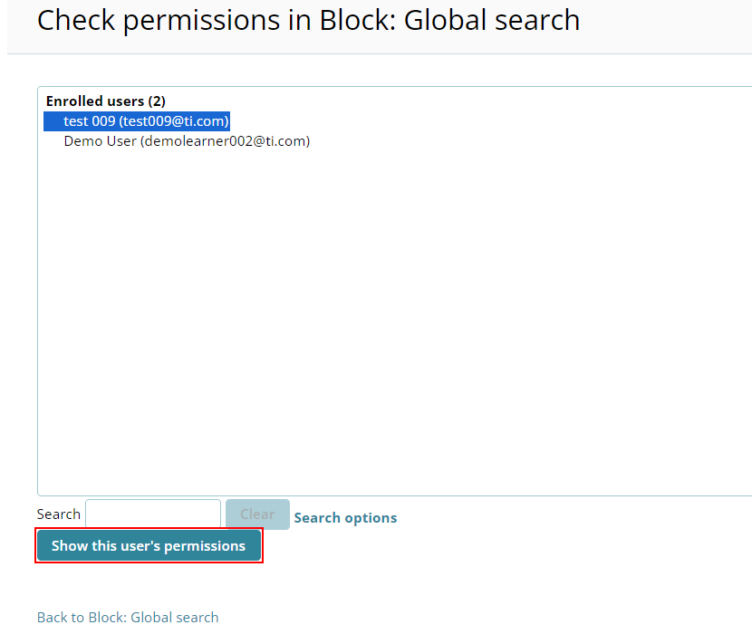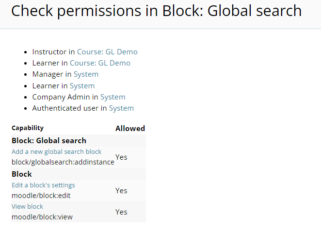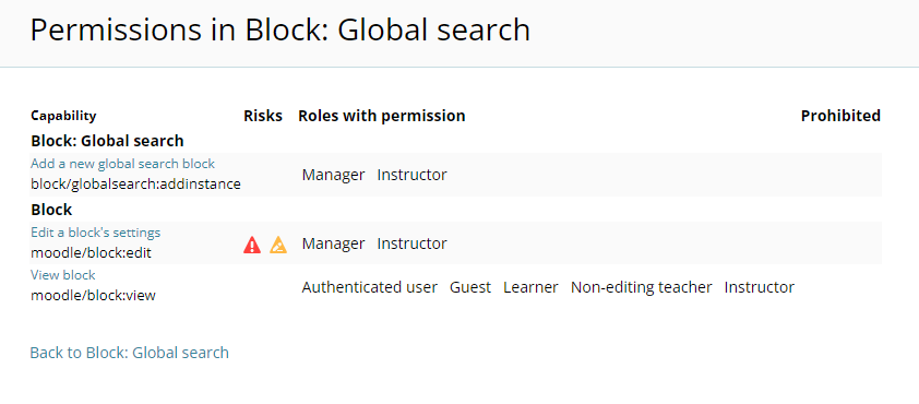 - The Permissions in Block displays the capability, risks, roles with permissions, and