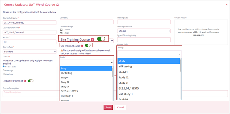 - On the Edit course screen, enable the Site Training Course toggle button and select a study from the dropdown options.