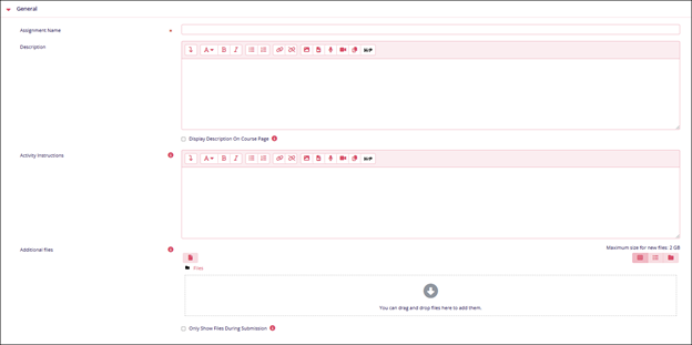 General Settings Name Description. Assignment Name* Enter a short and suitable assignment name. Description Enter the assignment description. Activity Instruction Enter the Activity Instructions. Additional Files Drag and drop or upload additional files. Only show files during submission Check or uncheck the checkbox.