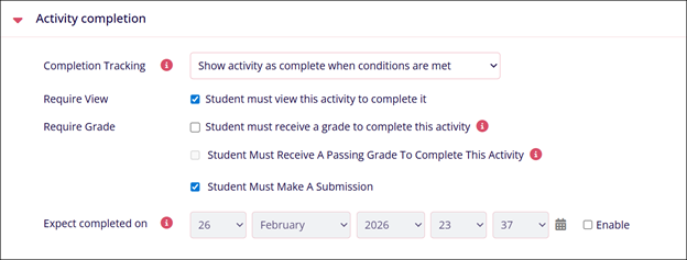 Activity Completion Name Description. Completion Tracking Select either of the following