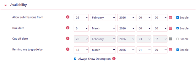 Availability Name Description. Allow Submissions from Specify a particular date and time. Enable or disable it by clicking on the checkbox. Due Date Specify a particular date and time. Enable or disable it by clicking on the checkbox. Cut-off date Specify a particular date and time. Enable or disable it by clicking on the checkbox. Remind me to grade by Specify a particular date and time. Enable or disable it by clicking on the checkbox.