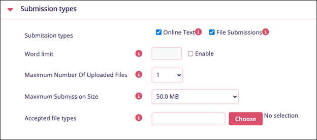 Maximum Number of Uploaded Files Specify the maximum number of files a student can upload Maximum Submission Size Specify the file size limit. Accepted file types Mention the file types that can be uploaded.