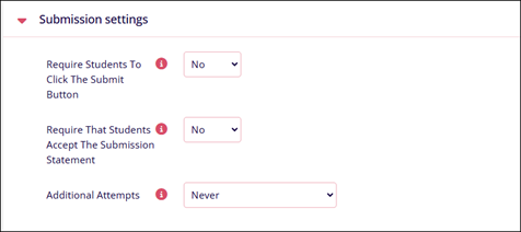 Submission Settings Name Description. Require Students To Click the Submit button Select either Yes or No Require That Students Accept the Submission Statement Select either Yes or No Additional Attempts Select either of the following