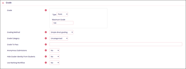 Grade Category Select Uncategorized Grade To Pass Mention the minimum grade necessary for a student to pass Anonymous Submissions Select either Yes or No Hide Grader Identity from Students Select either Yes or No Use Marking Workflow Select either Yes or No