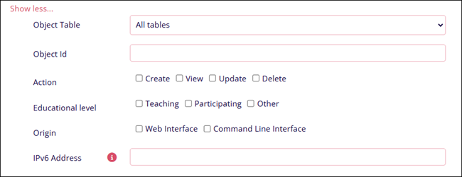 Filter Description Object Table Select the object table from the dropdown options. Object Id Enter the object ID. The object ID acts as a unique identifier assigned to an object or entity within a system, database or application. Action Select the following action by clicking on the checkboxes.
