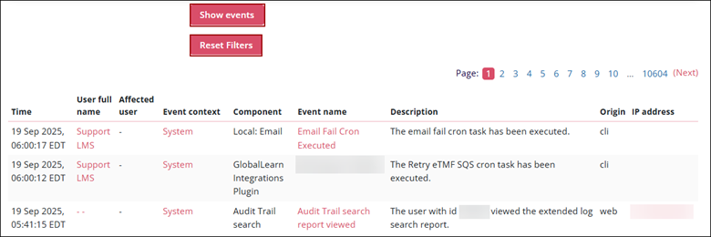 Filter Description Even Took place after Click on the checkbox to enable the filter and set a date and time by clicking on the calendar icon. If this date is set, the events that took place after this date are taken into consideration. Event Took place before Click on the checkbox to enable the filter and set a date and time by clicking on the calendar icon.
