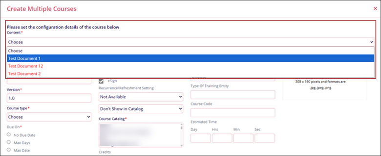- On the Create Multiple Courses screen, select training content from the Content* dropdown,