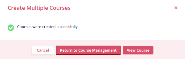 - The Create Multiple Courses popup displays the success message. Click on the Return to
