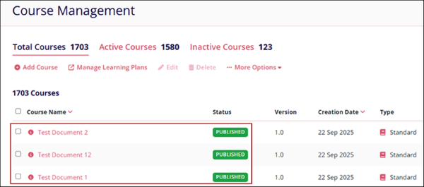 - The courses are displayed on the course management screen.