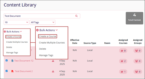 The Create a Course feature allows course creation directly through the content library and with the selected documents as training material.