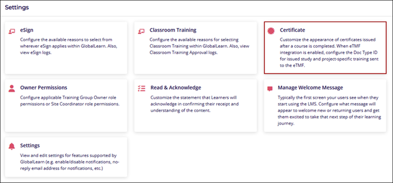 This section helps the user customize the certificate's appearance after the course is completed. When the eTMF integration is enabled, configure the Doc Type ID for the issued study and send project-specific training to the eTMF.