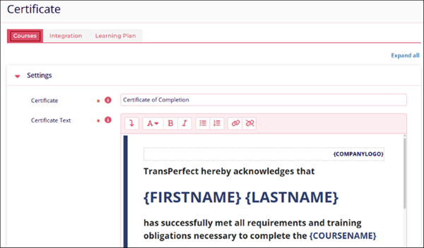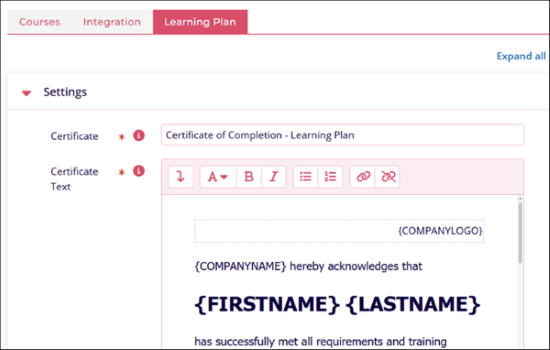 The Learning Plan tab allows users to customize a certificate for learning plan courses. Once learners complete courses in a learning plan, the certificate they receive will be dependent on the customizations made in the Learning Plan tab.